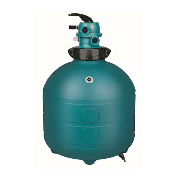 Filtro con válvula fabricado en polietileno resistente a agentes químicos y atmosféricos. Moldeado de una sola pieza con pie integrado en el filtro. Con válvula top de 6 vías.