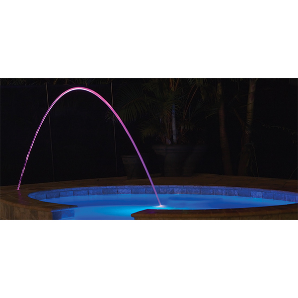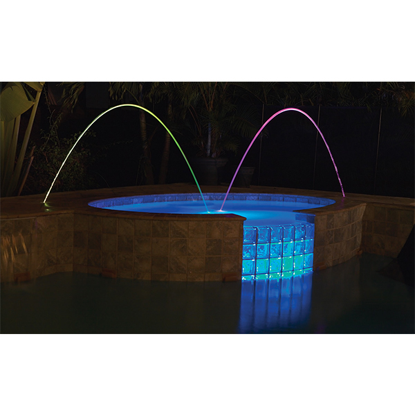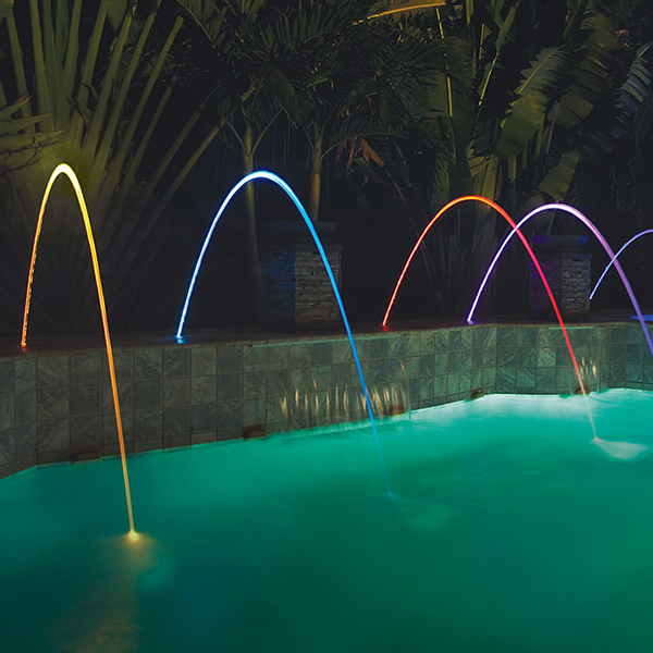 Los laminares MagicStream le añaden vistas y sonidos impactantes al área de la piscina al crear arcos de agua uniformes que son transparente de día y muy coloridos de noche.