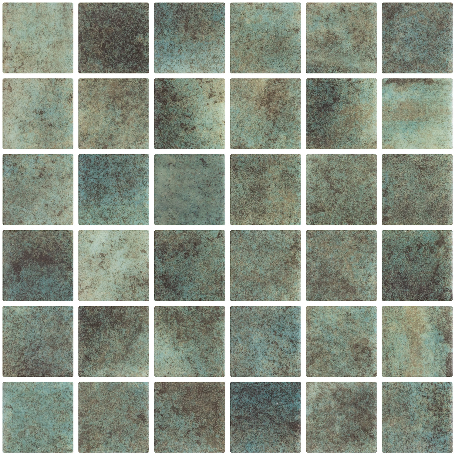 Este mosaico grande en verde con un acabado que combina brillo y mate, imita la textura de la piedra natural proporcionando una superficie robusta y estéticamente atractiva.